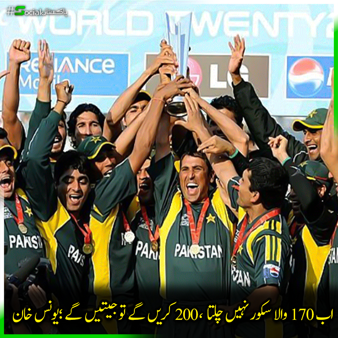 ٹی ٹوئنٹی ورلڈ کپ 2009 کی فاتح پاکستان ٹیم کے کپتان یونس خان کا کہنا ہے کہ اب ٹی ٹوئنٹی کرکٹ میں 200 رنز کریں گے تو میچ جیتنے کی پوزیشن میں آئیں گے ۔ 170 والا سکور اب نہیں چلتا۔ پاکستان کی ٹیم 7 سے 15 اوورز میں افغانستان کے بعد سب سے کم اوسط سے رنز بنانے والی تین ب گئی ہے اور یہی 9 اوورز اس کی مسلسل شکست کا سبب بن رہے ہیں ،کراچی میں میڈیا سے گفتگو میں یونس خان نے کہا کہ ضروی ہے کہ پاور پلے کے بعد مڈل اوورز میں بھی رنز بنانے کی رفتار 8 یا 9 رنز فی اوورز رہے تاکہ ٹیم اچھا ٹوٹل بناسکے۔انکا کہنا تھا کہ پلیئرز کو اپنا گیئر تبدیل کرنا ہوگا۔ بابر اعظم، فخر زمان اور رضوان کو اگلے گیئر میں جانا ہوگا۔